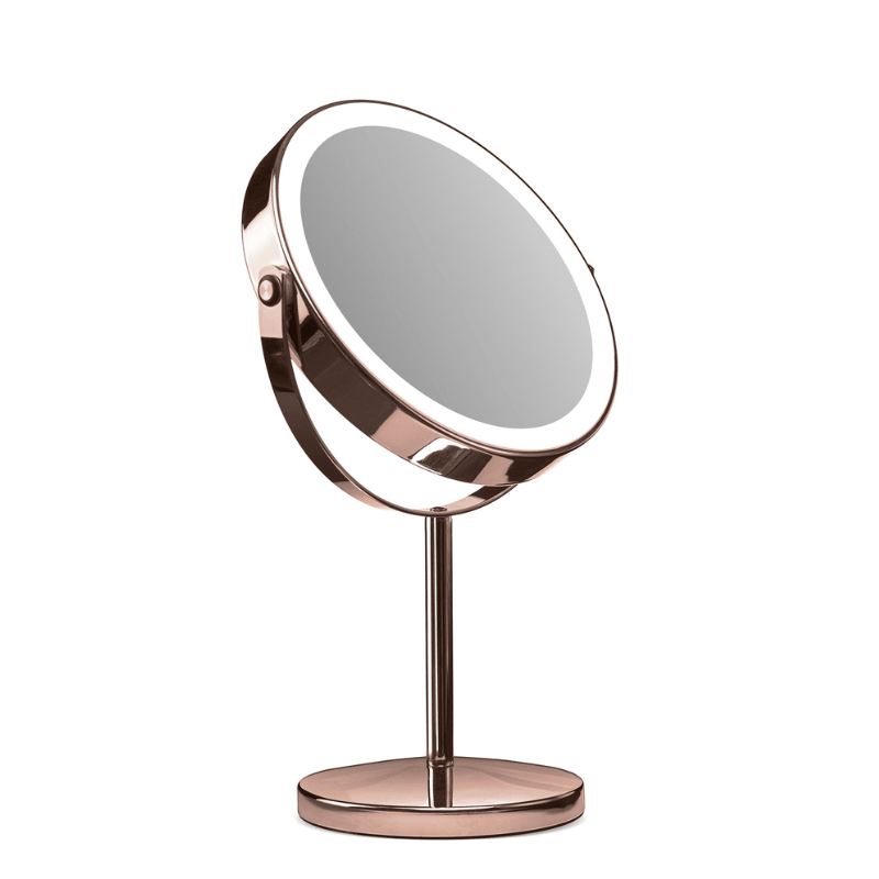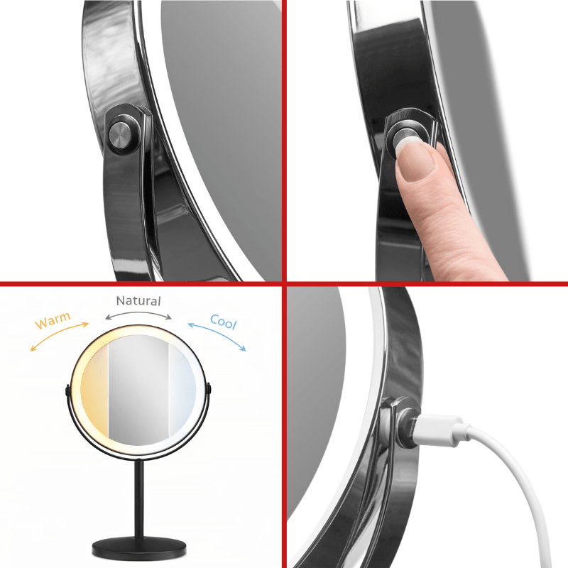 Genopladeligt LED-bordspejl med et kraftigt, integreret LED-lys, der kan indstilles i tre forskellige lysnuancer: varm, neutral og kold. Via en diskret touch-knap på siden styrer du nemt både tænd/sluk, valg af lysfarve og justering af lysstyrken med den indbyggede dæmpningsfunktion.