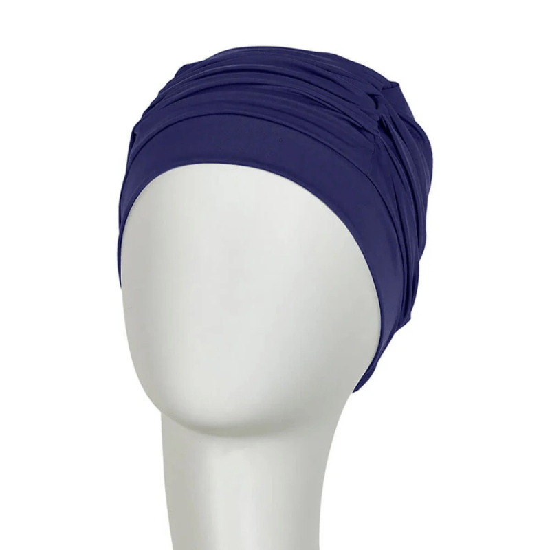 Den smukke rynkeeffekt på huen tilfører perfekt volumen til hovedet, og huen strammer ikke som en almindelig badehætte. Det bløde materiale er let, absorberer ikke vand og tørrer hurtigt.