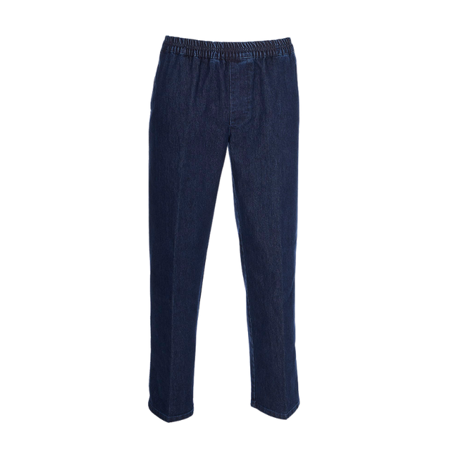 These denim pants offer exceptional comfort with an elevated rise and an elastic waistband.