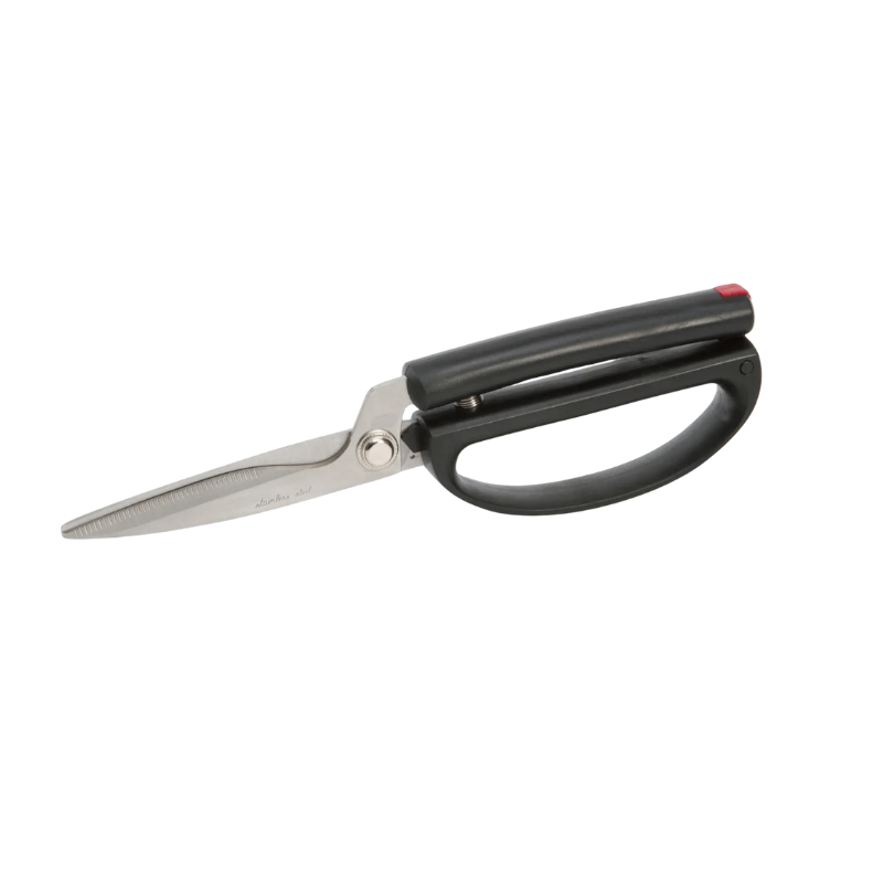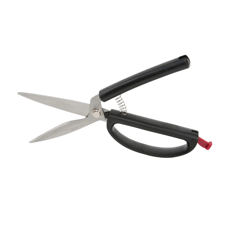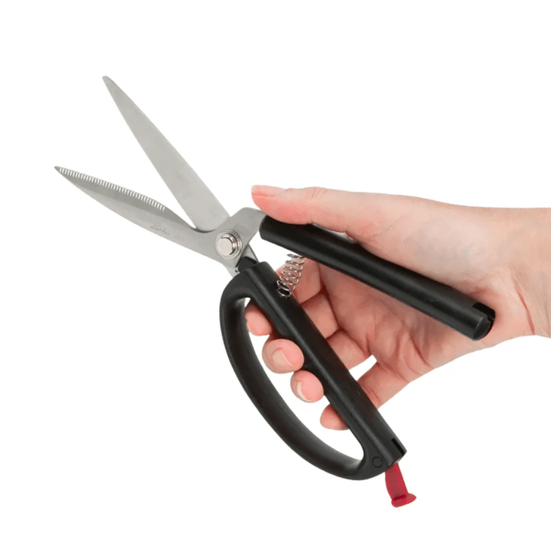 Kitchen scissors featuring a large, comfortable grip. Designed with a spring mechanism, the scissors automatically open, making cutting effortless.