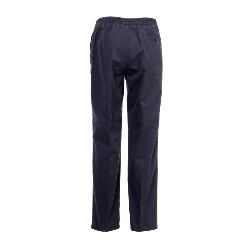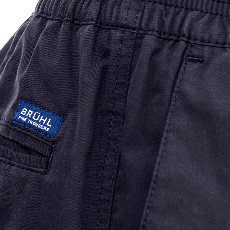 Lightweight and classic navy blue pants in soft fabric from Brühl, featuring an elastic waistband – no buttons or zipper. These pants come with two deep front pockets and a single back pocket with a button closure.