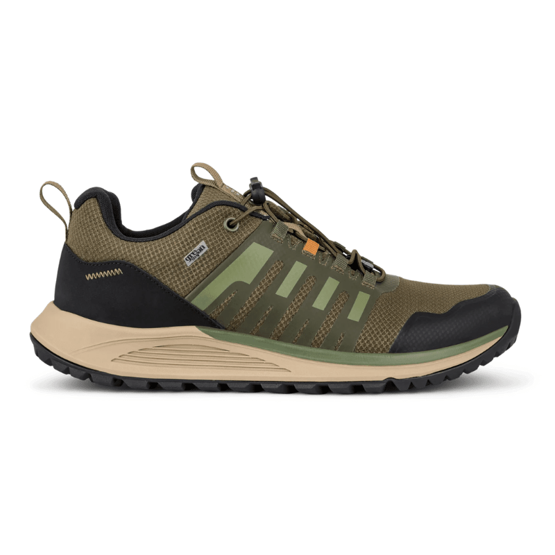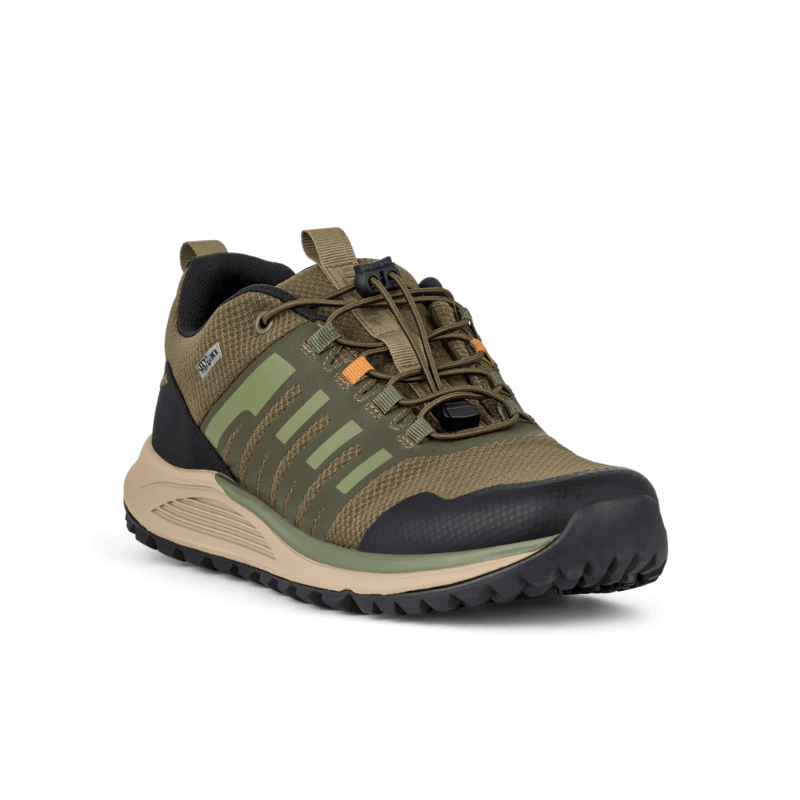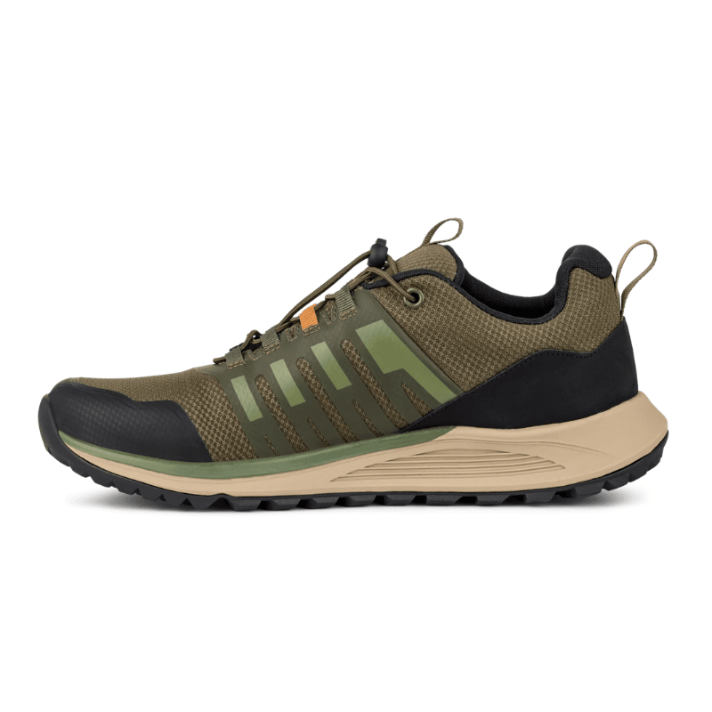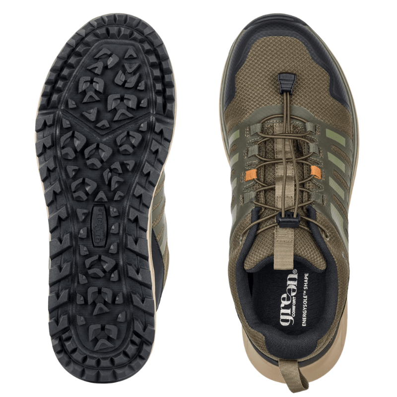 Light and spacious Green Comfort men's shoe in olive green with a breathable textile and mesh upper, providing excellent ventilation and comfort. The shoe features elastic laces with a quick-lock system, allowing you to easily adjust the fit.
