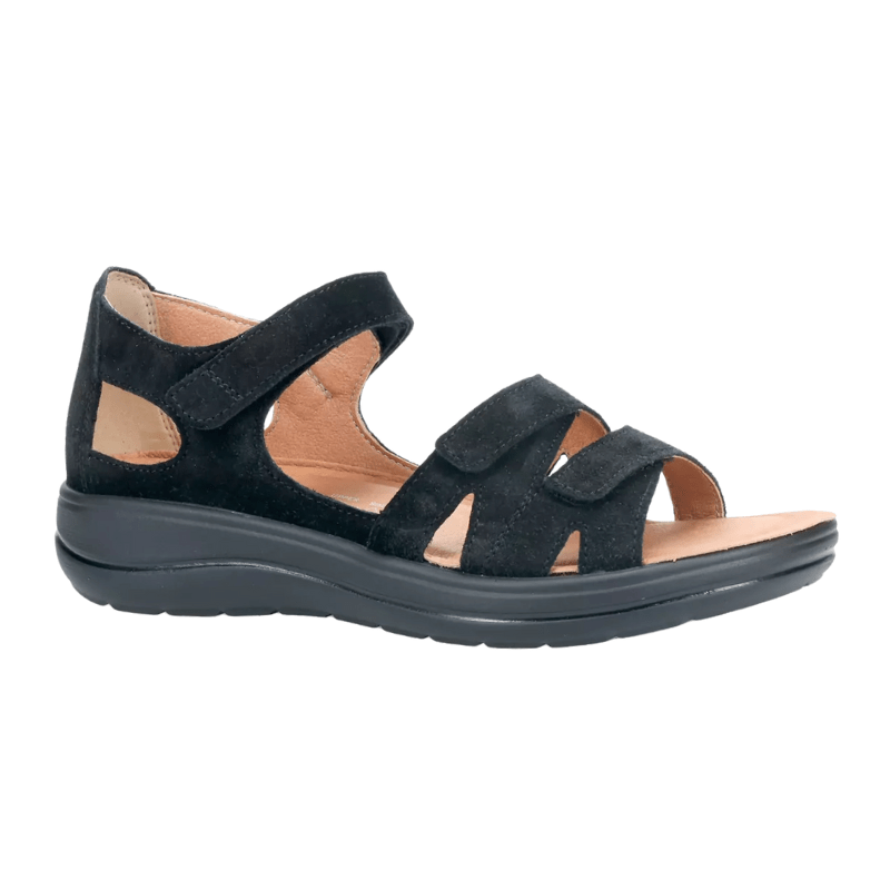 Black Hartjes women's sandal made from soft suede, featuring three adjustable Velcro straps for the perfect fit without pressure.