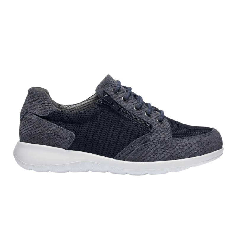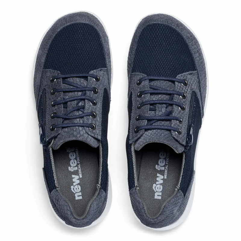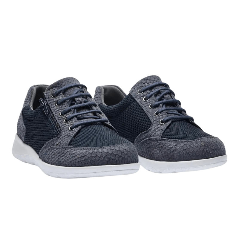 Elegant dark blue sneaker from New Feet, crafted from a mix of suede and textile with striking snakeskin-like details. The shoe features both laces and a zipper, making it easy to put on and adjust for the perfect fit.