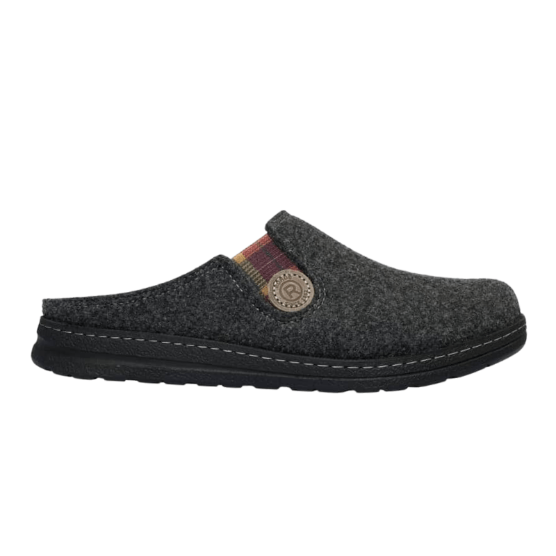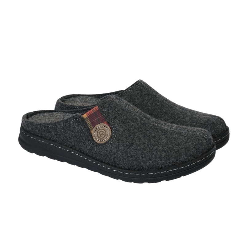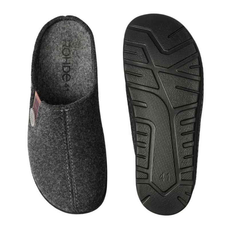 These comfortable men's house slippers, crafted from durable charcoal grey felt by Rohde, offer excellent support and keep your feet cozy all day long. The elastic side makes it easy to slip the shoe on and off, while ensuring a secure and comfortable fit. The black rubber sole provides good stability and features a slip-resistant pattern, allowing you to move confidently on any surface.
