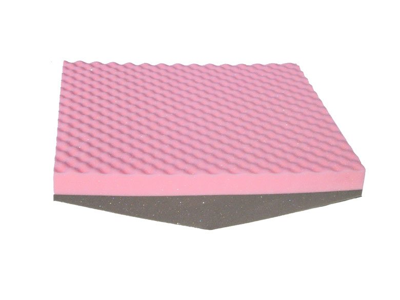 The cushion is both pressure-distributing (anti-decubitus) and pain-relieving. It is medium-firm and intended for users of medium weight, with a maximum user weight of 110 kg. It features a pink surface with a gray base (4 cm pink + 6 cm gray) and is made of 100% SAFE ViscoPore foam.