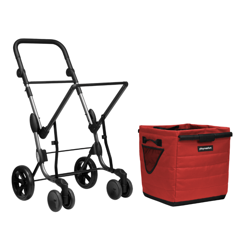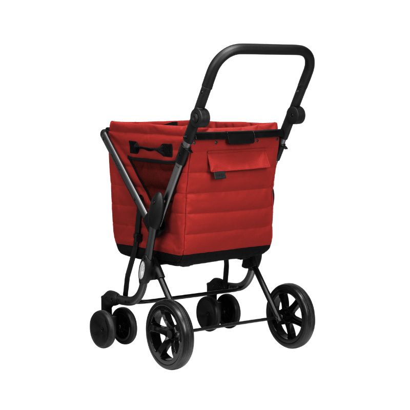 The shopping cart comes with a spacious textile basket made from durable, waterproof material. In this model, attaching and detaching the bag from the frame is easier, and the inner lining can be removed and washed.