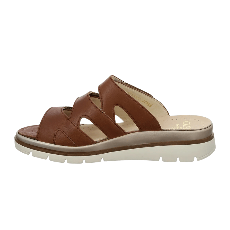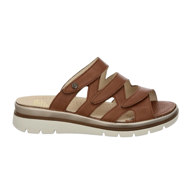 Super komfortabel og rummelig dameslipper fra Fidelio i glat læder i en gylden brun farve – lige til at stikke i. Sandalen har smidige velcroremme og er let polstret, så den former sig efter foden og reducerer tryk på f.eks. knyster.