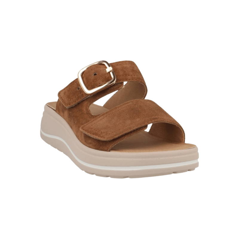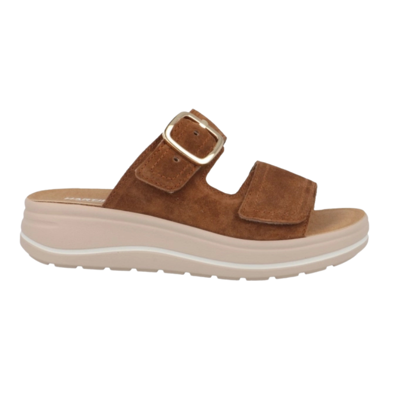 Elegant Hartjes dameslipper i cognacfarvet ruskind, som føles blødt mod huden og giver en smidig pasform over foden. De justerbare remme med velcro gør sandalen let at tilpasse individuelt, så den sidder godt fast.