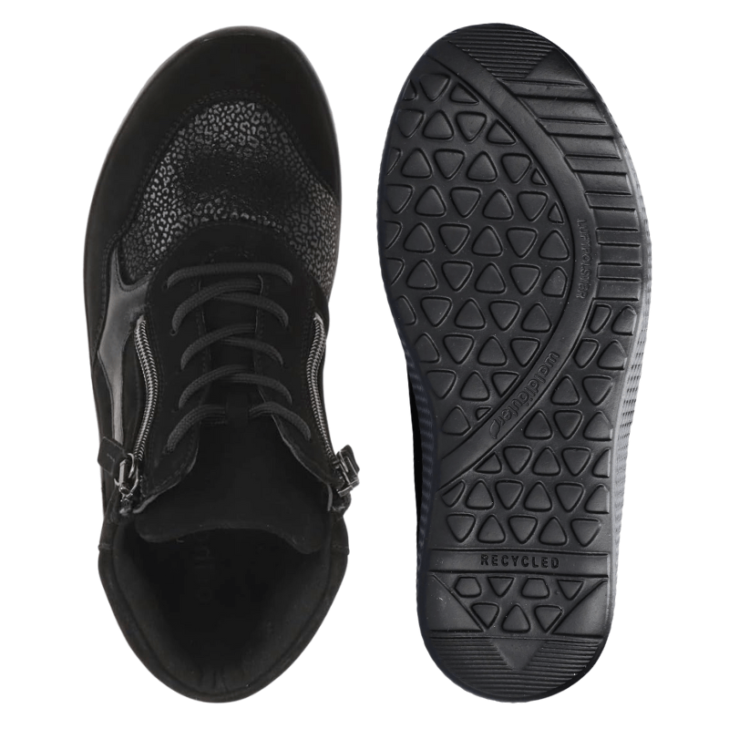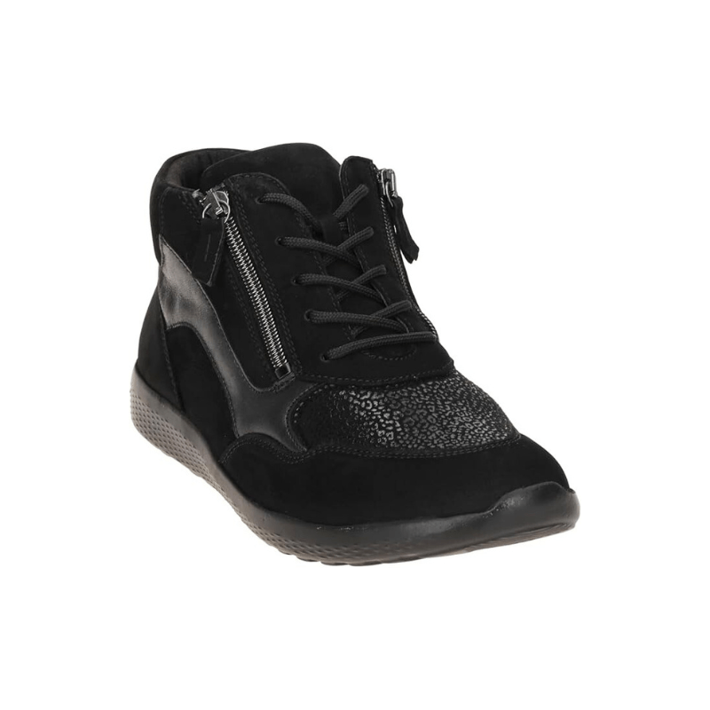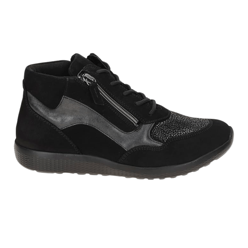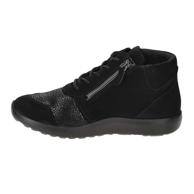 Flot sort sneaker fra Waldläufer i en kombination af læder og tekstil, som sørger for god åndbarhed. Skoen har både snørebånd samt en praktisk lynlås i siden, så den er nem at få af og på. Pasformen er ekstra bred, så den er ideel til brede og følsomme fødder.