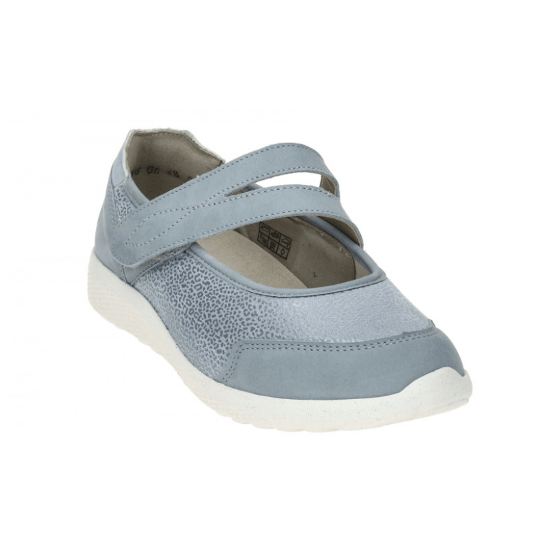 Elegant lyseblå ballerina i blødt nubuck kombineret med stretchmateriale, der giver en behagelig og fleksibel pasform. Den praktiske velcrolukning gør skoen nem at tage af og på og sikrer en god pasform.